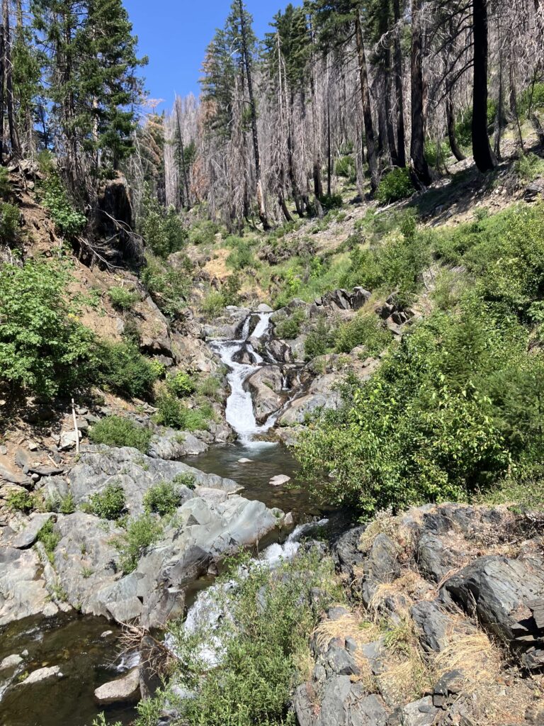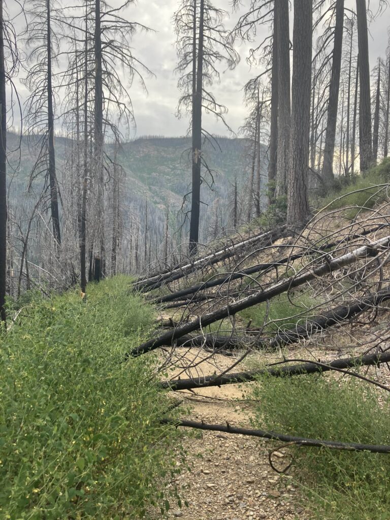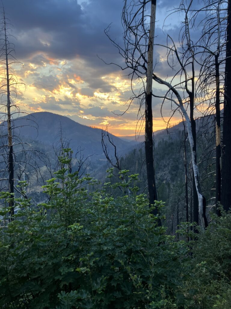 The next day, the sadness of missing Ben, after briefly getting to be together again, really hit me. This was not amazing timing, as I also began the long trek through one of the largest burned areas on the trail – the aftermath of the Bear Fire of 2020 and the Dixie Fire of 2021 (the largest single source fire in California history). I started going through the worst of the burned area late in the afternoon, so the heat and exposure wasn’t too bad. As I went along though, the trail got more and more overgrown and the number of fallen trees blocking the trail kept increasing. Eventually it got so bad that the recommendation from other hikers was to cut over to a dirt road that paralleled the trail for about 3 miles. The road was also overgrown and full of fallen trees, but it was at least easier to follow. As I continued climbing over trees, my mood worsened. It was the end of a long day, I missed Ben, and I was tired of this. I don’t generally complain about a trail just because it is hard. But hiking through a burn isn’t hard in a fun or satisfying way. It is hot, tedious, and depressing, knowing that a few years ago, this was an alive and beautiful forest. I finally made it down to the bottom of the valley, to a nice, though crowded, tent spot by a river. (The other thing about burn zones is that you don’t really want to camp amidst the dead trees that might fall on you, so camping options are much more limited than usual.)
