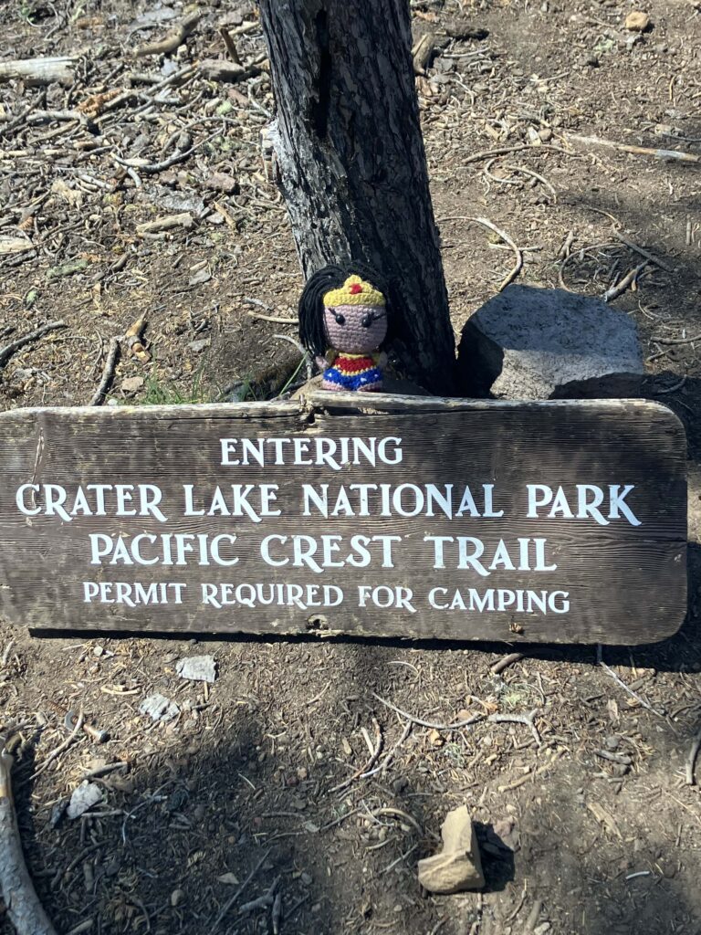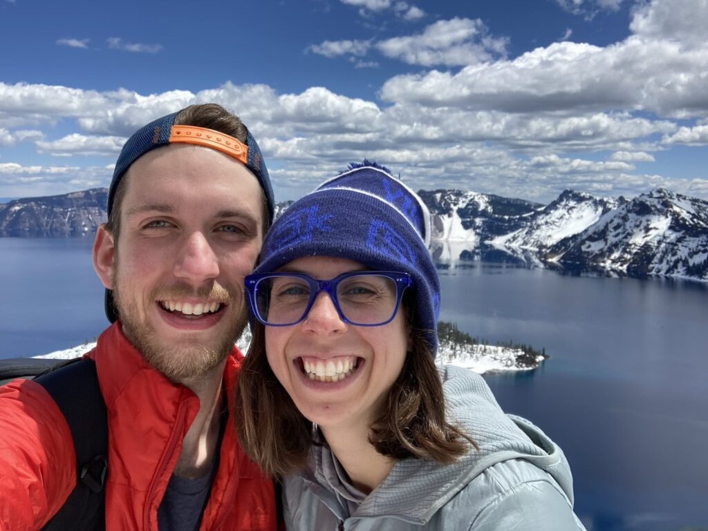 The next day was even warmer, the woods sparser and then giving way to a badly burned and exposed section of trail with little water. Oregon is, so far, much better at trail maintenance than California, with no overgrown bushes and most fallen trees cleared from the trail. But there are still a few gnarly sections of downed trees, mostly in burned areas, and this was one of them. So, not the easiest going. All of this was made manageable though by the fact that the section ended in Crater Lake National Park. Indeed, as if by magic, pretty much as soon as the trail crossed the park boundary, the burn ended and the trail was in excellent condition. Crater Lake is a section of the trail that everyone looks forward to, with good reason. Unfortunately, surrounding fires had made the whole area thick with smoke, not really ideal conditions for experiencing the lake. I’m lucky enough to have been there several times, and it is in fact a very special place for me, as it is where I proposed to Ben. (We agreed that I should be the one to propose, because I am better at planning and executing surprises.) So I was happy to be back, even if it wasn’t under the hoped for circumstances. The trail was closed in the park and for about 60 miles north. The camp host at the park campground was giving daily rides around the closure, so I signed up to go with him the next morning. You could still hike the rim trail around part of the lake, but given the thick smoke, I had decided not to, preferring to come back and hike this section at a better time. Indeed, the next morning when we drove along the rim headed north, there was so much smoke that you couldn’t see the lake at all. (Since I wasn’t able to get any pictures on this trip, here is a picture from when Ben and I got engaged, with the lake the way it was meant to be seen and experienced.)