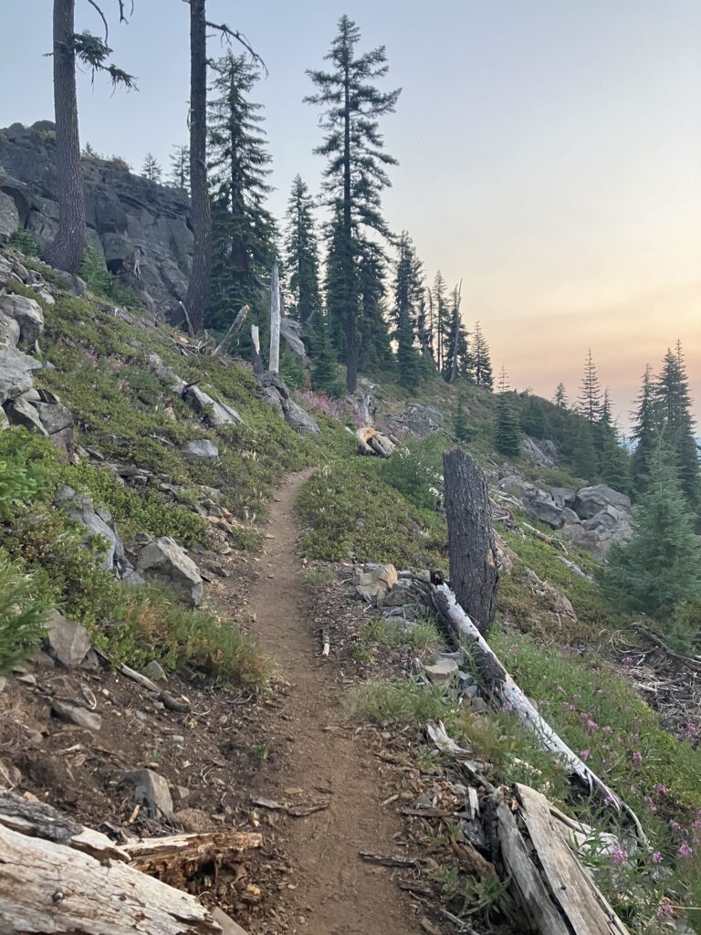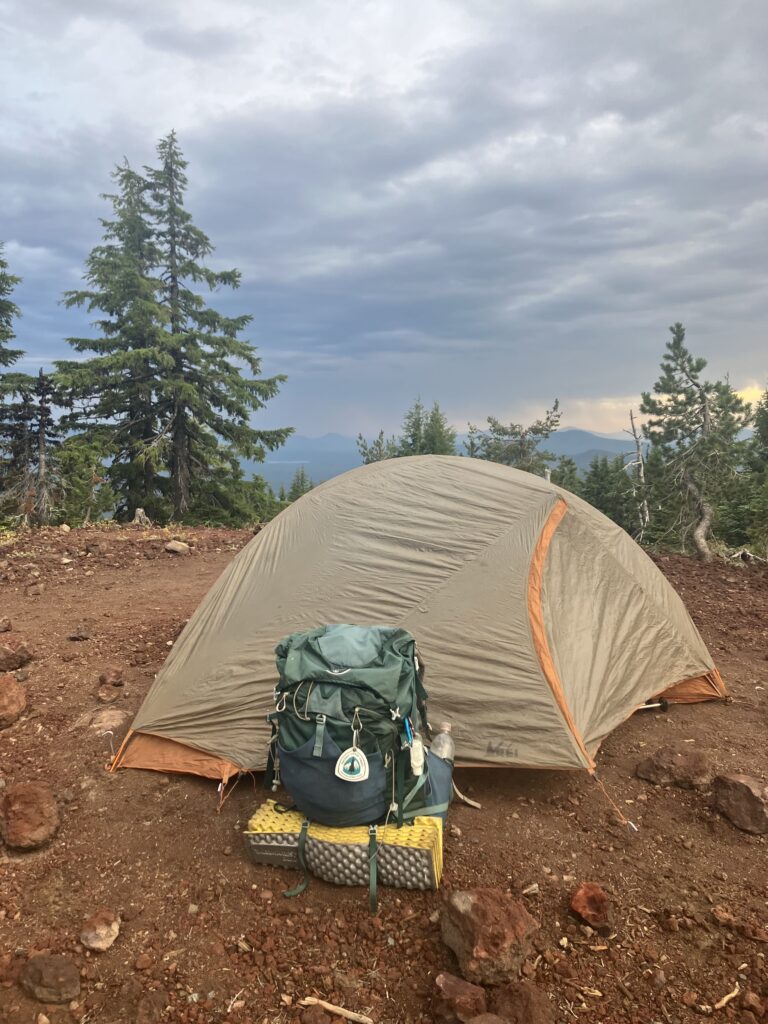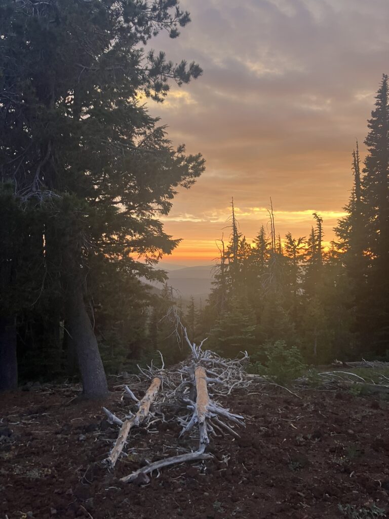 After that patch, though, it was back to a green woodlands with frequent ponds. Additionally, as if I had manifested it by spending most of the previous day thinking about how I missed rain, the day was overcast and sprinkled rain intermittently. It was the kind of Pacific Northwest summer rain that you can basically ignore, and it made me very happy. I lived outside of Seattle until I was five and I’m told it rained the full first year of my life, so I really wasn’t made to endure this much sun. In the evening, there was another lake resort, Elk Lake, about a mile off trail. While I did still technically need to eat my own food, I was having a good day and a hot meal by a lake seemed like a good addition. This choice really paid off for me. The resort had a great deck on the lake (in true PNW fashion, no one really cared that it was periodically raining), there was live music, and the table next to me talked to me a bit about the trail and then kindly paid for my food, which was incredibly good. (I feel like I also manifested my free dinner – at Crater Lake, I’d been talking to a hiker who said a couple had given him $40 to buy dinner, and I noted that while this had happened to me a few times on my bike trip after college, it hadn’t happened on this hike. Perhaps I no longer looked sufficiently sad and pathetic. Thankfully, I apparently still do.) I headed back to the trail with a waffle cone in hand, thinking life could hardly be better. It could though, just a little bit, as the rain cleared just in time for a beautiful sunset, and I had a great tent site basically on top of a mountain.