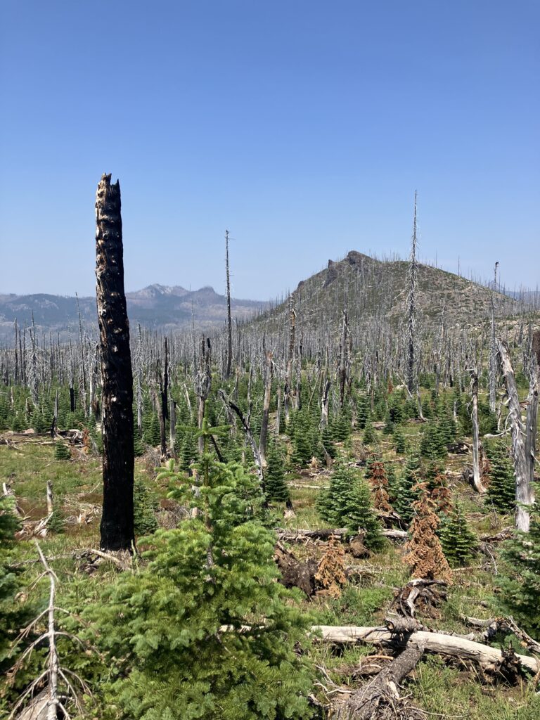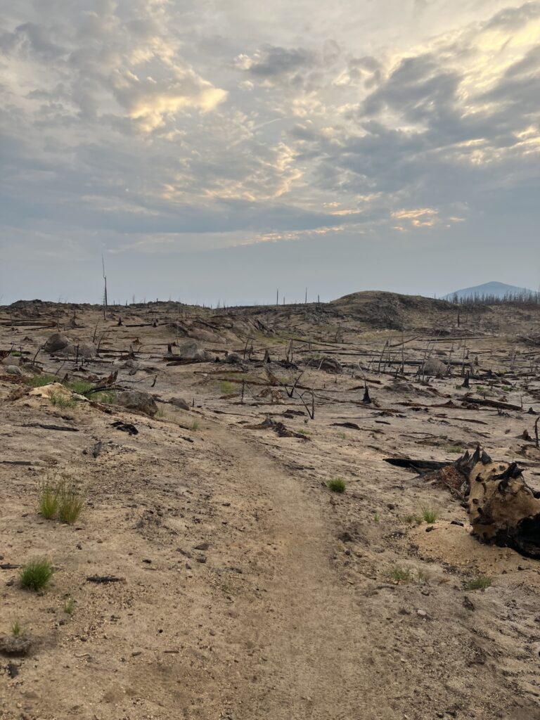 The next morning, almost immediately after leaving camp, I headed into a five mile section of absolutely destroyed burned forest. Most burn zones are like walking through the skeleton of the forest that was once there – the trees are dead, but the bones are there and you can see the shape of what once was. In this section, there was little left but ash and stumps. (Hikers like to think of the Lord of the Rings when they are traversing epic mountain ridges, but here was the part where Merry and Pippin lead Treebeard to see the destruction of the forest around Isengard and everything goes very quiet.)