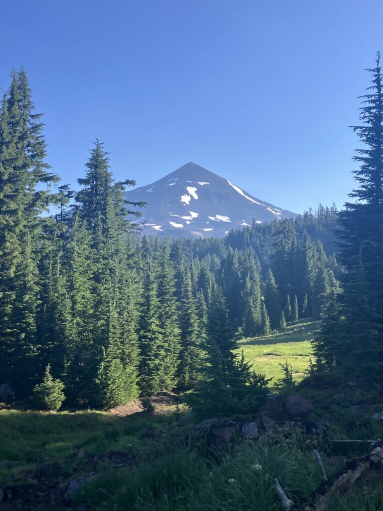 The next day was also quite nice, though sadly back to being sunny, and featured quite a lot of variety, a counterpoint to all the naysayers who said Oregon was “boring.” Unlike the continuous range of the Sierras, the volcanic mountains of the Cascades, such as Mount Shasta, Mount Hood, Mount Rainier, were generally singular, isolated peaks that loomed enormous over the landscape around them. Growing up in Washington, I’d always found this to be the most impressive form of mountain. (It was also honestly quite a while before I understood that not every mountain was an active volcano.) The trail in central and northern Oregon mostly goes from giant mountain to giant mountain, and now it was going around the Three Sisters (as you might guess, three large peaks clustered together – there’s also a Little Brother sub-peak). Several pleasant miles were spent going through meadows with incredible views of the mountains. The trail then went through the Obsidian Limited Entry area, a geologically odd couple of miles featuring a decent waterfall and copious amounts of the shiny black rock.