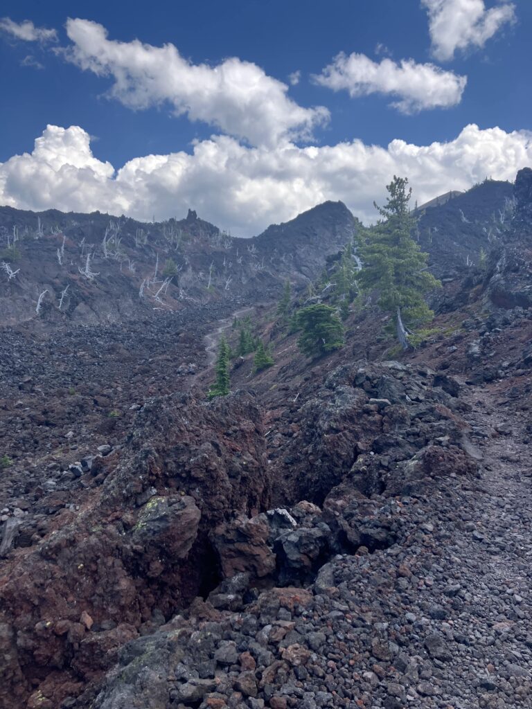 After the meadows and mountain views, the afternoon was very different, transitioning abruptly to a vast and seemingly endless field of lava rocks. (Here is where we ascend into Mordor.) Thankfully, it was not especially hot, since this was a long, dry, exposed section of trail. It was not especially easy going either, traipsing over the small (but not that small) loose rocks. It was, however, interesting and sort of bizarrely cool, like being on a different planet. I had known roughly when the field started, but didn’t actually know when it ended. Perhaps at the upcoming road crossing? But no, I got to the road, crossed, and saw lava rocks as far as the eye could see. I supposed I lived in the lava field now. After a few more rocky miles, I got to my planned campsite, which I saw now was some flat spots beneath some live trees that had somehow managed to grow in the middle of the rock field. In what I imagine is probably a pretty unique camping experience, I went to bed amongst my friends, the lava rocks.