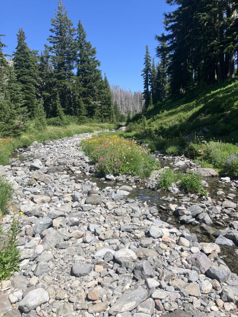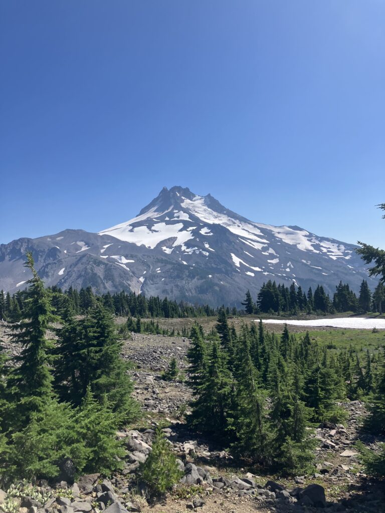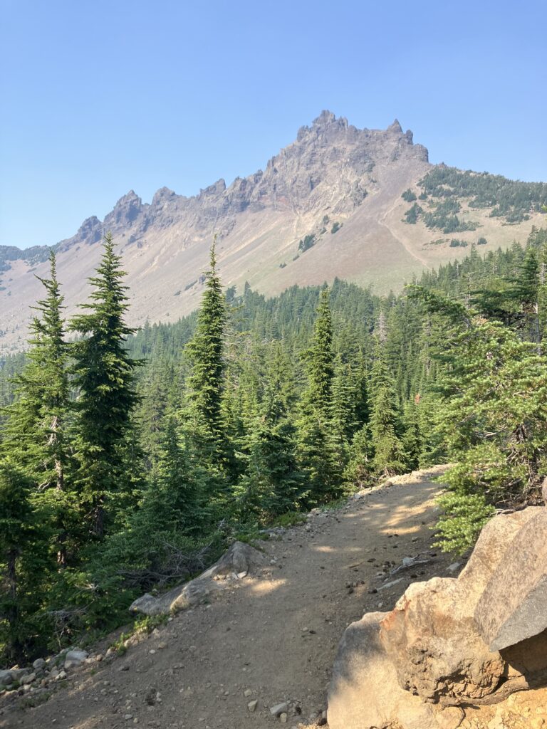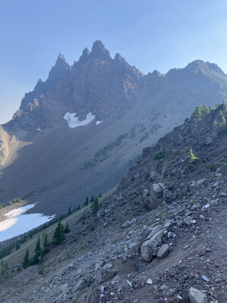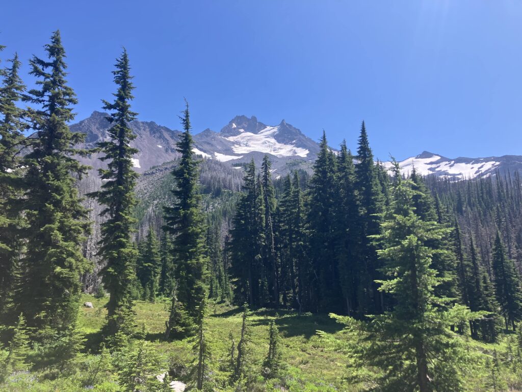 The next day, the trail climbed further to an area at the base of Mount Jefferson called Jefferson Park. Thankfully, this part of the forest hadn’t been burned and was still a pristine area of meadows, flowing creeks, and evergreen trees, all in the shadow of the enormous, snow-covered Mount Jefferson. Though it was only a few miles, this was one of my favorite sections of the trail so far, a really prime example of the beauty of the Cascades. Unfortunately after that high point came another low point. Coming down from the mountain, the trail went into one of the longest burn areas in Oregon, 14 or so miles. Other burn zones had been bearable because they weren’t very long or because there was other scenery in the area. But this one was just boring, ugly, blackened trees that went on for far too long and was full of pointless ups and downs. I was abruptly very over it and sad all over again that each year, more of the trail looks like this. I finally made it out as it was getting dark and found a place to camp under alive trees that probably weren’t going to fall on me.