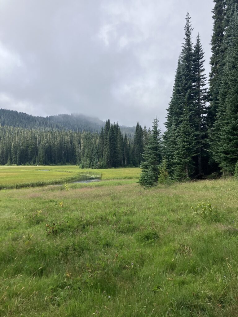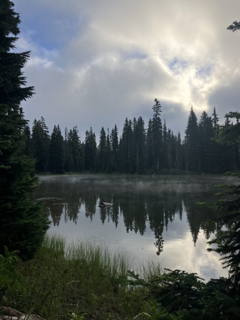 Eventually, I left the store and hiked a few miles before setting up camp for the evening, my first real Washington miles. The next day, I had an extremely leisurely day, with just nineteen miles to the campsite that I wanted to stay at near Chinook Pass, where I’d get off to go into Mount Rainier the next morning. It turns out, at thru hiker pace, nineteen miles is really too few miles to fill a day, and I took a lot of very long breaks, barely knowing what to do with myself. I met several weekend hikers who, on hearing how many miles I’d done so far in the day, told me I was “really moving” though I would have described what I was doing as more like moseying. At least there was beautiful scenery and it was a perfectly nice area to meander my way through. Eventually I set up near a pretty, and popular, lake and got ready to get up early and see if my detour would work out.